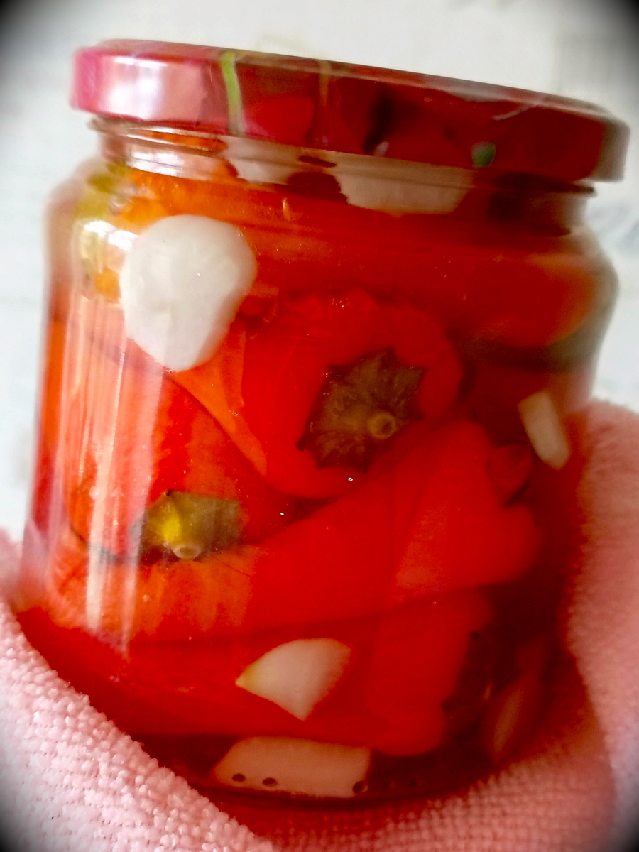 По рецепту Оксаны, канал "КУХНЯ НАИЗНАНКУ" Зимние запасы пополняются! Вчера я закатала компот из моих райских яблочек, которые собрала на своей даче, а сегодня на очереди жареный перец - это одно из моих любимых лакомств. Это блюдо просто невероятно вкусное. Мои перчики уже покраснели. Они лежат на балконе в пакете. Не все конечно , но достаточно для того , чтобы начать готовить эту заготовку. Часть , которые самые красивые уже я выбрала, а остальные отправила на балкон на дозревание. Особенно радует сорт "фьюджи" , это такие маленькие аккуратные перчики, которые на мой взгляд больше всего подходят для этого рецепта. Я выращиваю их уже два года подряд , и похоже это не последний раз. Я их помыла, обрезала хвостики и положила на полотенце хорошенько просушиться. В баночки, у меня пол литровые, стерилизованные, я сразу на дно положила чеснок, по пол ч.ложки соли, по одной ст.ложки сахара и по полторы ст.ложки 9% уксуса. Затем приступила к жарке перца. Налила масло в сковороду и пар