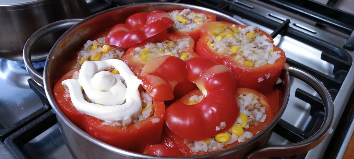 🌷 Фаршированные перцы в томатном соусе — с рисогречкой и кукурузой (6 шт