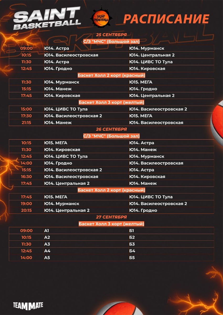 🏀 С 25 по 27 сентября «Манеж» из Великого Новгорода будет представлять наш город на соревнованиях в Санкт-Петербурге! Сегодня стартует турнир «Saint Basketball» среди юношей 2014 года рождения. В группе «Манеж» встретится с тремя командами из Санкт-Петербурга и одной из Гродно. Расписание игр представлено на фото. 📹 Прямую трансляцию матчей можно будет увидеть в группе SAINT BASKETBALL в социальной сети ВКонтакте.