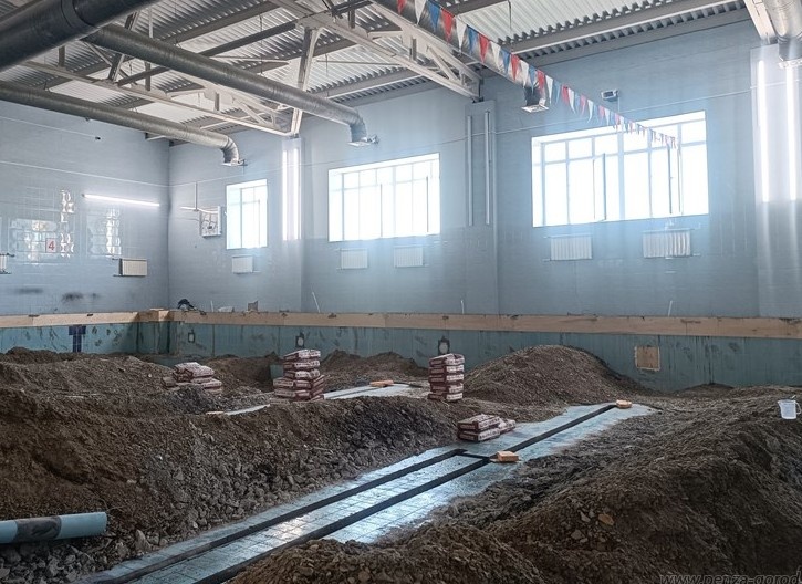 Сейчас специалисты монтируют технологическое оборудование: насосы, запорную арматуру и трубы. В ближайшее время планируется устройство трубопровода аварийного перелива чаши и трубопровода для отведения сточных вод с проходных дорожек. Следующим этапом станет монтаж напольного покрытия в зале бассейна, включая гидроизоляцию и систему теплого пола.