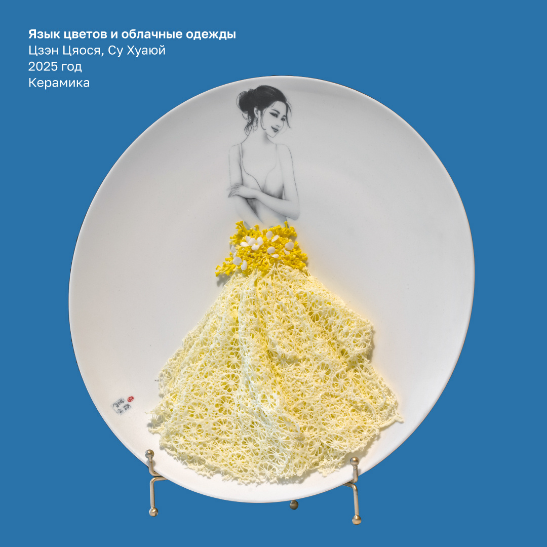 Китайский белый фарфор Дэхуа — застывшая поэзия. На нашей выставке она оживает и говорит с нами на языке современности. Давайте проследим, как древнее искусство оживает в руках современных мастеров. Представьте, что кружево сплели не из ниток, а из тончайшего фарфора – это то, что мы видим в работе «Язык цветов и облачные одежды», которая выходит за рамки традиционного искусства и объединяет керамику и моду. Платье-кружево, сотканное из фарфора, рассказывает историю о мечте, женственности и вечном обновлении жизни, а хрупкость материала – о силе и грации. Ваза «Благороднейший из благородных» - это пожелание счастливой жизни в самой совершенной форме. Это поиск баланса между традициями и инновациями, создавший уникальный фарфоровый шедевр. Яркие цветы символизируют страсть, богатство и нежность, а чистая форма вазы — гармонию и благополучие. Работа «Благополучие и удача» - это двойное благословение. Фарфоровый жезл «Жуи» и цветы пиона — самые сильные символы удачи в китайской культуре.