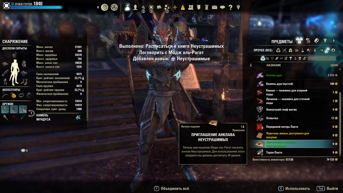 Новички, пока не разберутся в интерфейсе, и во всех объявлениях, и рекламе из лаунчера, могут пропустить игровое событие. Если вдруг поздно спохватились, не поздно залететь на ивент даже на середине события. С чего начать? Они пришлют приглашение с повышением уровня. Прочитав его, можно вступить в гильдию неустрашимых и бегать данжи хоть каждый день. Чтобы снова найти оповещение об ивенте, которое поведет по вступительному квесту, надо зайти в кронный магазин, в раздел «События» и выбрать вступительный квест там. Краткий и неинформативный инструктаж от данмерки можно пропустить. Понадобится найти в инвентаре «Приглашение анклава Неустрашимых» и прочитать. Теперь можно будет расписаться в книге в лагере Неустрашимых. По сути, контракт о вступлении в гильдию. Это отдельное мероприятие, своего рода инструктаж от НПЦ. Так со всеми ивентами происходит, есть какой-то гид по ивенту, который доводит вас до квестодателей и вкратце объясняет суть ивента. Его квест берется в начале ивента в кро