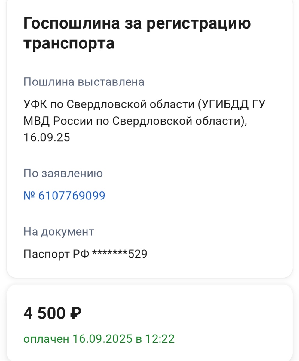 - Записался на постановку на учёт через ГОСУСЛУГИ на 21,09,2025г. на 15:00, там же оплатил пошлину за постановку и номера 4500₽.