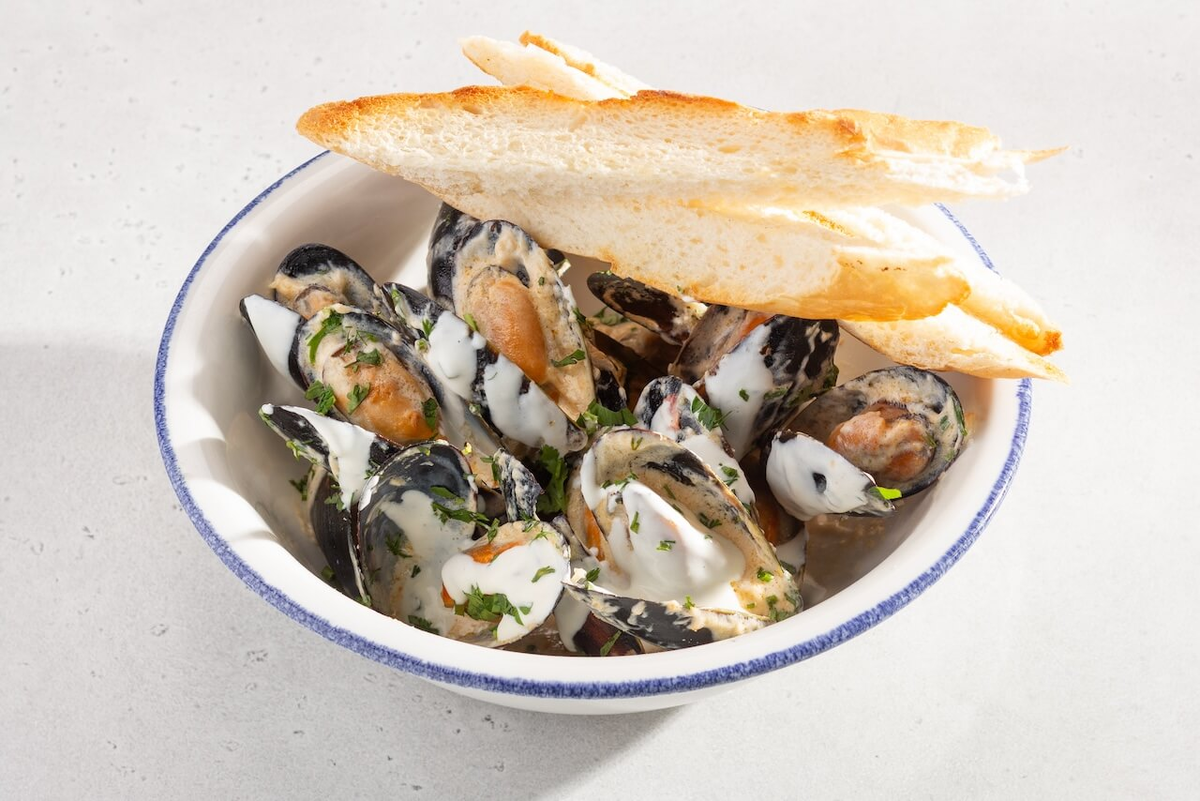 Мидии в белом вине и с багетом в Chere Maman на Трубной