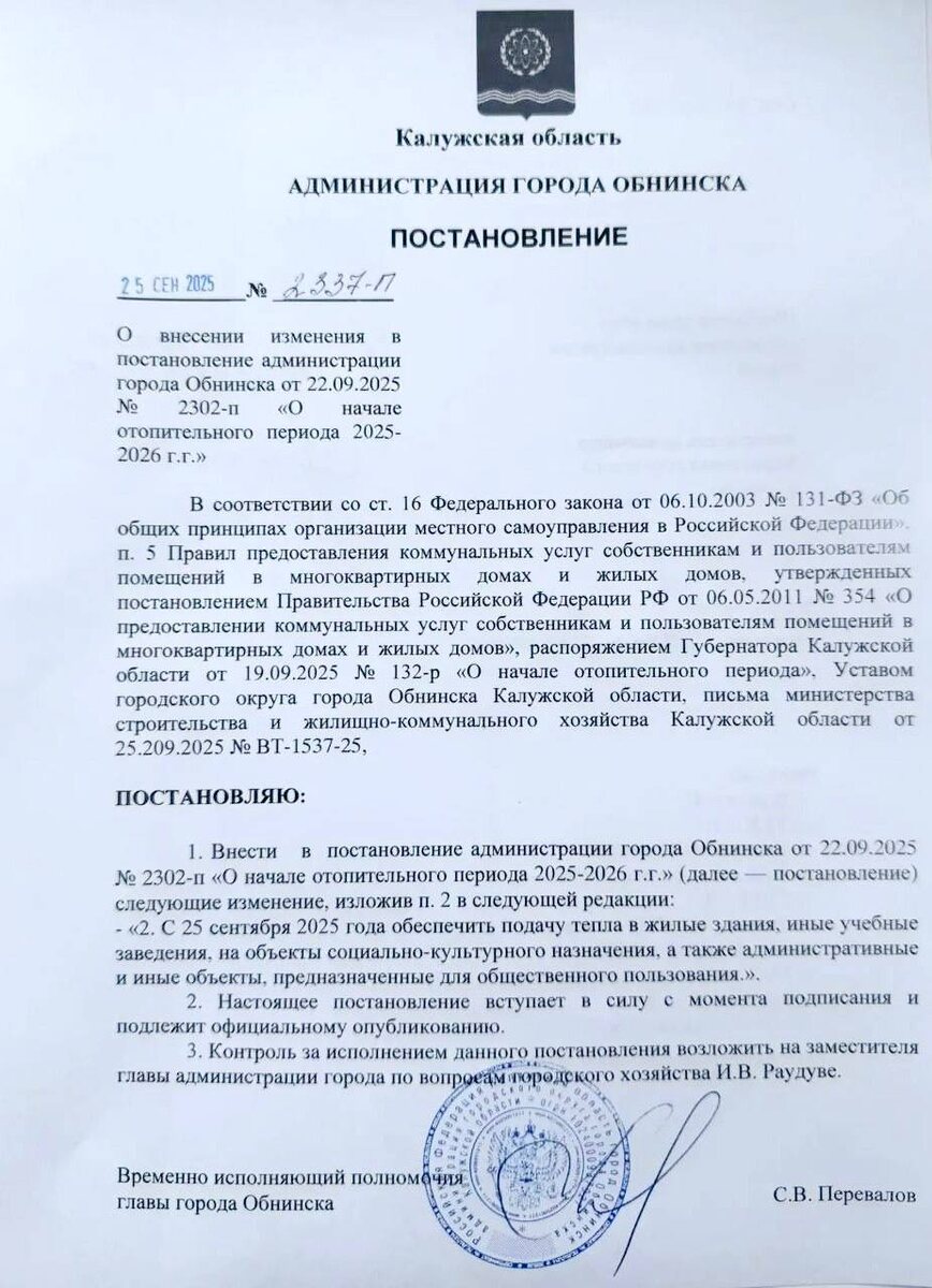 Соответствующее постановление подписал временно исполняющий полномочия главы города Обнинска Стефан Перевалов.