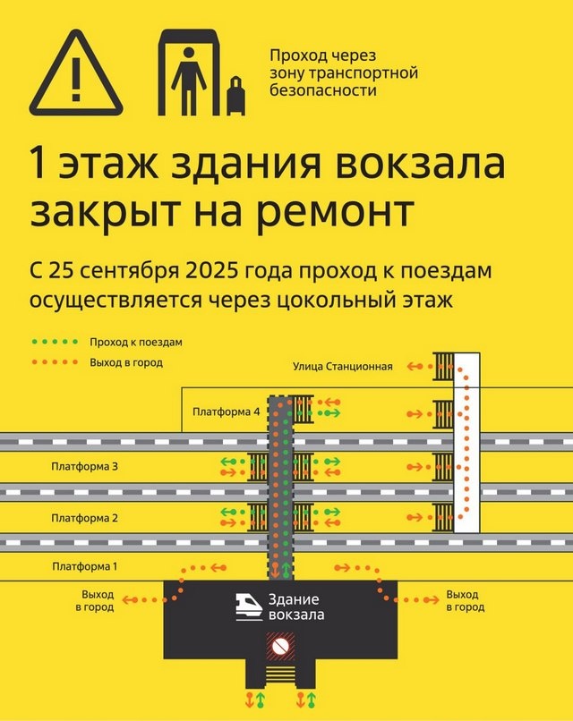 С 25 сентября на вокзале Курска изменится схема прохода в здание и к пассажирским платформам. Как сообщили в минтрансе Курской области, это связано с началом ремонта на 1-м этаже, который будет закрыт. Вход в вокзал будет осуществляться со стороны Привокзальной площади. Проход к платформам №№1 и 6 теперь осуществляется через цокольный этаж, затем – по лестничному маршу с южной стороны вокзала на первый этаж. Проход к платформам №№2, 3 и 4, к кассам дальнего и пригородного сообщения, а также в зал ожидания и санитарные комнаты будет осуществляться через цокольный этаж. Выход в город с платформ — через выходы, расположенные с северной и южной сторон вокзала. Для помощи пассажирам с ограниченными возможностями здоровья на вокзале Курск будут работать сотрудники Центра содействия мобильности ОАО «РЖД». Работы на первом этаже железнодорожного вокзала Курска планируется завершить до конца года. Сергей Яшин, фото минтранса Курской области Постоянный адрес новости на сайте «Друг для друга» ~ h