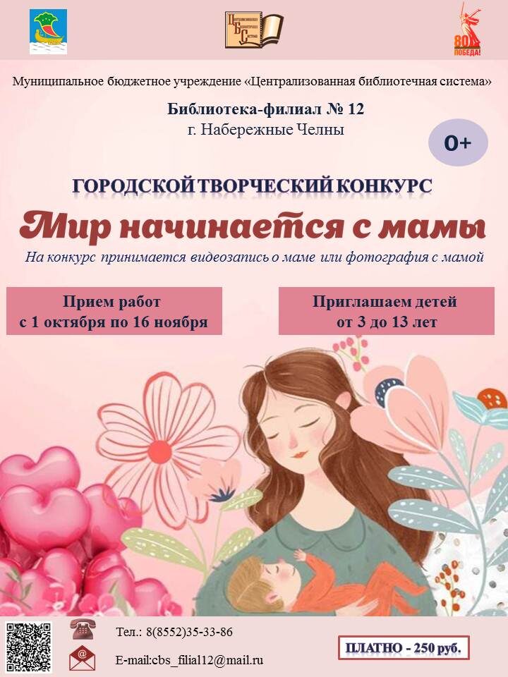 С 1 октября по 16 ноября 2025 года МБУ «Централизованная библиотечная система» приглашает детей с 3 до 13 лет включительно принять участие в городском творческом конкурсе «Мир начинается с мамы», приуроченного ко Дню матери.