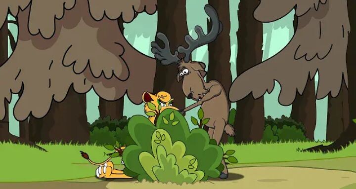 1. Лев — главный герой, лидер зверей, грубый и властный. 2. Волк — верный помощник льва, часто попадает в неловкие ситуации. 3. Медведь (Миха) — изобретатель, создаёт аппарат для лося. 4. Лось — объект насмешек, часто становится жертвой розыгрышей. 5. Ёж — друг лося, вместе с ним ищет еду. 6. Свин — хитрый и жадный, пытается найти еду у волка. 7. Львица — жена льва, ищет зубную щётку. Сцена 1: Лев и волк в лесу Волк: Наконец-то после недельного отдыха лев окончательно пришёл в себя. Он решил прогуляться по своим владениям. Следом за ним шкандябил волк. Лев: Странно, как это вы лес не засрали? Это даже как-то очень подозрительно. Ну ладно, по лесу всё ясно. Пошли проверим тупую лошадь. Сцена 2: Лев и волк у медведя Лев: Привет, Миха. Чё мутишь? Медведь: Тебе чё тут надо, придурок? Лев: Так это, гуляю я. Вот зашёл тебя проведать, интерес, так сказать, прогнать за твою душу. Медведь: Считай, что проведал. Теперь газуй отсюда. Лев: Миха, ну скажи, чё мутишь? Тебе сложно, что ли?