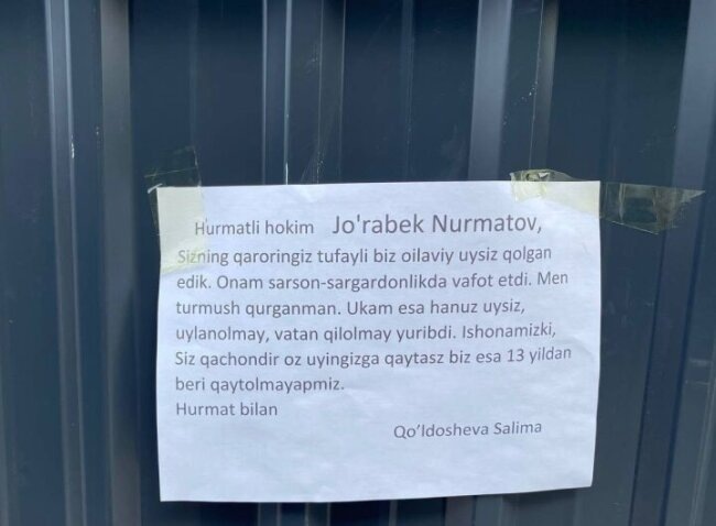 По информации рабочей группы хокимията, созданной для изучения обстоятельств, изложенных в обращении, с заявительницей - гражданкой Салимой Кулдашевой - был проведён детальный опрос. В ходе беседы установлено, что ранее она не обращалась напрямую ни к хокиму района, ни в другие инстанции с имеющимися проблемами. При этом опубликованное письмо было тщательно изучено и на его основании начата работа по оказанию ей практической помощи.