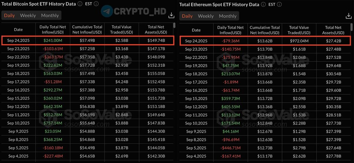 😐 SV: Возобновился ПРИТОК капитала в Bitcoin ETF = +$241,000,000 за вчерашний день. ОТТОК денег из Ethereum ETF (#ETH) пока продолжается = -$79,360,000 за вчерашний день. Crypto Headlines