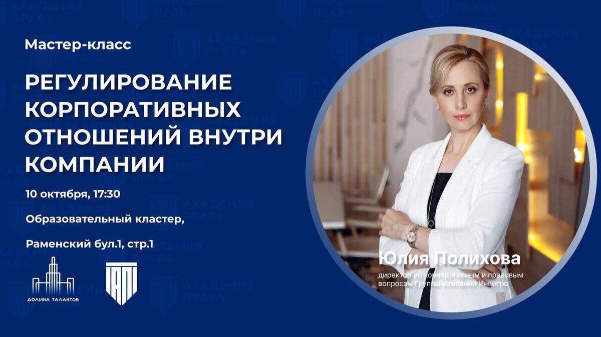📣 Мастер-класс «Регулирование корпоративных отношений внутри компании» 🕒 Дата: 10 октября 🕖 Время: начало в 17:30 (по мск). 💻 Формат: очно 📍 Образовательный кластер, Раменский бул. 1, стр.1 Приглашаем вас на мастер-класс, который проведёт Юлия Полихова — директор по корпоративным и правовым вопросам Группы компаний Инвитро и автор образовательной программы «Юрист-инхаус с нуля 2.0: от теории к практике». 💡 На мастер-классе разберем следующие вопросы: • Как регулируются корпоративные отношения внутри компании. • Корпоративный конфликт • Роль юриста-инхауса в принятии ключевых бизнес-решений. 🎯 Этот мастер-класс будет особенно полезен: • Студентам юридического факультета • Начинающим юристам, которые хотят построить карьеру в бизнесе • Юристам-инхаусам, стремящимся повысить свою экспертизу Что вы получите: ✅ Практические кейсы из реальной практики ✅ Ответы на свои вопросы от практикующего юриста-инхауса ✅ Нетворкинг с единомышленниками 🔗 Зарегистрироваться бесплатно: https: