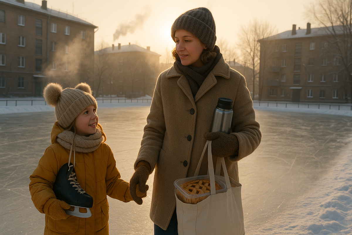 Я пришла во двор к маминому дому в субботу ранним морозным утром — снег под ногами похрустывал, как корка свежего хлеба, а в прозрачной синеве над крышами тянулись струйки пара. В руке — пакет с термосом и яблочным пирогом. Рядом семенила Василиса, на её шапке помпоны подпрыгивали — будто маленькие зайчики. Мы пришли не просто так: в чате маминых соседей на неделе всплыло забытое слово — «каток». Тётя Рая написала: «Когда-то заливали, и вся улица выходила. Может, хоть полезным делом детей займём?» С утра под окнами уже метались силуэты: кто-то тащил шланг, кто-то — лопаты, кто-то — рулон старого линолеума, чтобы снег который будут чистить отвозить как по маслу.