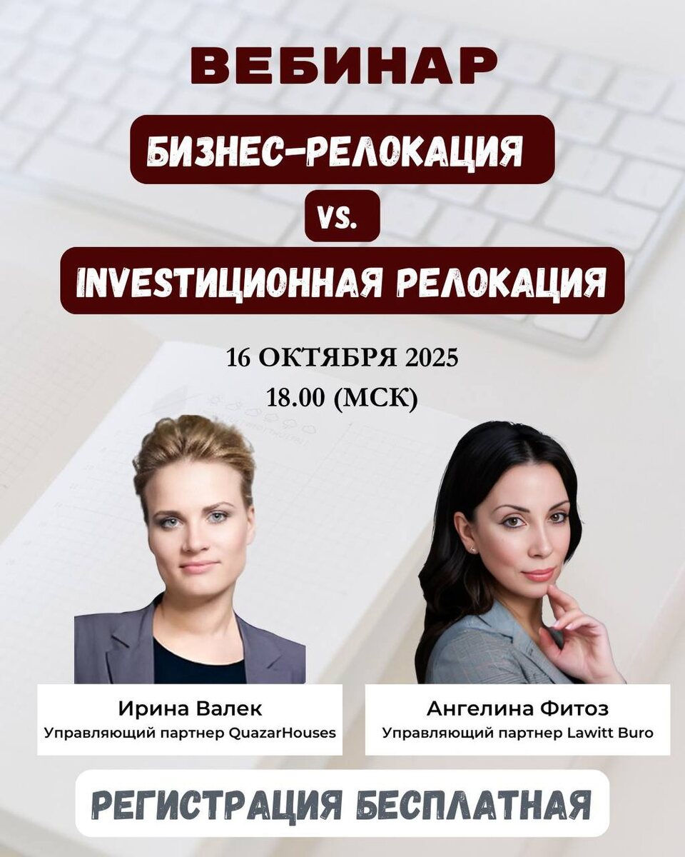 16 октября 2025 в 18:00 MSK ➡️приглашаем на вебинар: "Бизнес-релокация vs. Инвестиционная релокация". На совместном вебинаре эксперты Quazarhouses и Lawitt Buro поделятся вариантами решений для бизнеса в текущем срезе международной ситуации. 💬О чем поговорим на вебинаре: 🤩ПРОГРАММЫ ВНЖ И ГРАЖДАНСТВА; 🤩БИЗНЕС-РЕЛОКАЦИЯ; 🤩ЗАЩИТА И СТРУКТУРИРОВАНИЕ АКТИВОВ. 👤Спикеры вебинара: 🤩 ИРИНА ВАЛЕК CEO и эксперт практики инвестиционной миграции QuazarHouses, входящей в рейтинг лучших юридических компаний России, практикующих в области защиты интересов состоятельных клиентов — Forbes Club Legal Ranking как рекомендованная для работы при сопровождении миграционных вопросов. 🤩АНГЕЛИНА ФИТОЗ Соучредитель и управляющий партнёр Lawitt Buro, международной консалтинговой компании, входящей в рейтинги Best Lawyers и Top-5 FinTech с офисами в Москве, Дубае, на Кипре и в Ереване. ✅БОЛЕЕ ПОДРОБНАЯ ИНФОРМАЦИЯ И БЕСПЛАТНАЯ РЕГИСТРАЦИЯ #обучениезаграницейВНЖ #образованиеииммиграция #какполучить