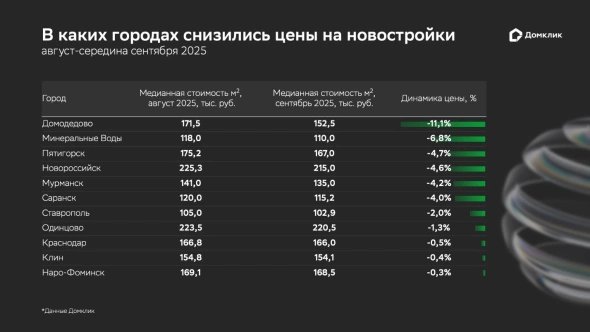 В основу рейтинга легли цены предложения из объявлений на витрине «Домклик». Динамика рассчитана как разница между медианной стоимостью 1 кв. м в августе и сентябре 2025 года.