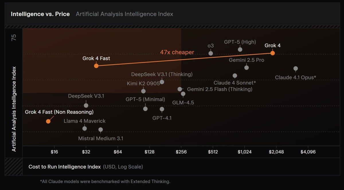 🔥КОГДА ИИ СТАЛ ДЕШЕВЛЕ, НО УМНЕЕ🧠💥 xAI просто вывалили на мир Grok 4 Fast Она в 47 раз дешевле Grok 4 🤯 А ещё? По некоторым бенчмаркам — она её ПОБЕЖДАЕТ. Контекстное окно — 2 миллиона токенов. Это значит, ты можешь загрузить четыре тома “Войны и мира” и спросить: “Кто на самом деле виноват в том, что Пьер потерял голову?” Она не просто прочитает — она выдаст анализ, мем про Наполеона и рекомендацию, где купить шубу в 1812 году. 🐴📚 И да — она умеет включать и выключать размышления. Простой вопрос? Ответ — за 0.3 сек. Сложный? Она включает режим “я сейчас как Эйнштейн, но с TikTok-смыслом” и вгрызается в задачу, как кот в коробке с лазерной указкой. А ещё? Она сама лазит по X и вебу, как будто у неё есть диплом по социологии и опыт в даркнете. Она читает видео, анализирует мемы, цитирует твиттер-бабушек и возвращает тебе реальный, живой, не отредактированный ответ. На LMArena — 8-е место. На Search Arena — №1. То есть, если тебе надо найти, где в Берлине купить лучший шницель — он