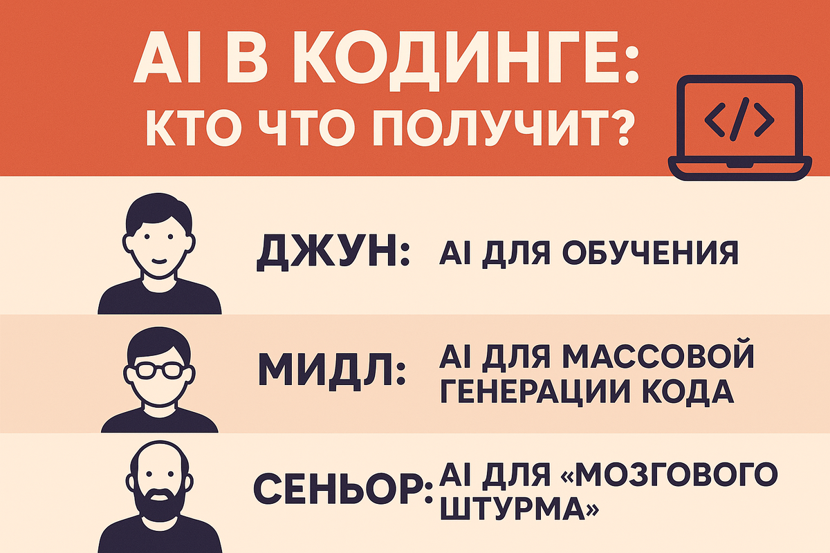 Много общаюсь с коллегами разных грейдов, заметил интересную штуку (забавно, что писал про это еще год назад, все забылось и вновь всплыло). Все генерят код, но результат у каждого свой. Многое зависит от реального грейда. Джун: AI для обучения Когда сидишь над задачей и не знаешь, как подступиться, AI подскажет, предложит варианты. Расскажет с чего начать и куда смотреть. - Как помогает: Помогает разобраться в ошибках, быстрее понять незнакомый код, генерирует типовые куски, на которые ушла бы куча времени. Это сильно ускоряет обучение. - В чём подвох: Есть большой соблазн просто копировать и вставлять. Потом в итоге не понимаешь, как всё работает, и если AI ошибся, ты не можешь это исправить. Надо себя заставлять разбираться, даже если AI уже всё написал. Мидл: AI для массовой генерации кода У мидлов другие проблемы. Они знают, как писать код, но много времени уходит на скучные, повторяющиеся задачи. Здесь AI работает как личный ассистент, который берёт на себя черновую работу. - Как