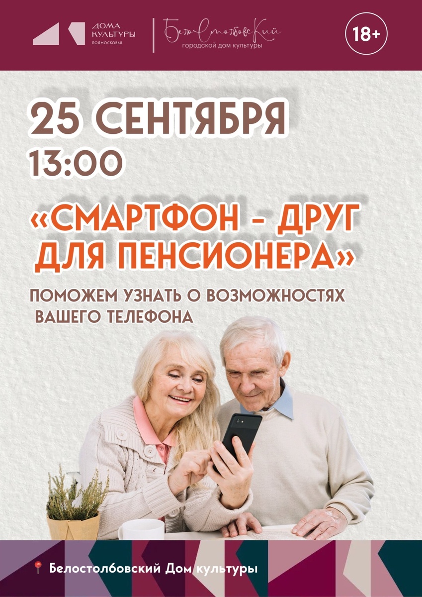 ✨ «Смартфон — друг для пенсионера» Узнайте, как ваш телефон может стать вашим помощником! 🚫 Возраст: 18+ 📆 25.09.2025🕒13:00 🏢 Белостолбовский городской Дом культуры (ГДК) 📍 г.о.Домодедово, мкрн.Белые Cтолбы, ул. Авенариуса стр. 1а ✅ Мероприятия Домодедово https://dzen.ru/id/66f10385cc4c5a16f7b5fb02 http://vk.com/domodedovo_events http://dzen.ru/domodedovo_events