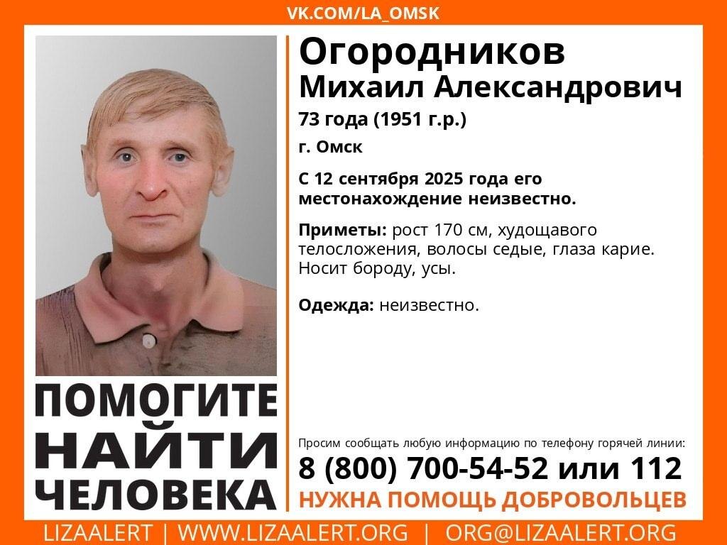 Михаил Огородников пропал 12 сентября, может находиться в столице Сибири. В Новосибирске ведутся активные поиски 73-летнего омича, Михаила Огородникова. Известно, что мужчина покинул свой дом 12 сентября, и с тех пор информация о его текущем местоположении отсутствует. Данные сведения предоставлены пресс-службой поисково-спасательного отряда «ЛизаАлерт» Новосибирской области. Пропавший, Михаил Александрович Огородников, родился в 1951 году. Его рост составляет приблизительно 170 сантиметров, отличается худощавым телосложением, имеет седые волосы и карие глаза. Среди особых примет выделяются борода и усы. Информации об одежде, в которой он был в день исчезновения, нет. Всех, кто обладает какой-либо информацией о местонахождении Михаила Огородникова или видел его, просят незамедлительно связаться с правоохранительными органами или позвонить на горячую линию добровольцев-поисковиков.