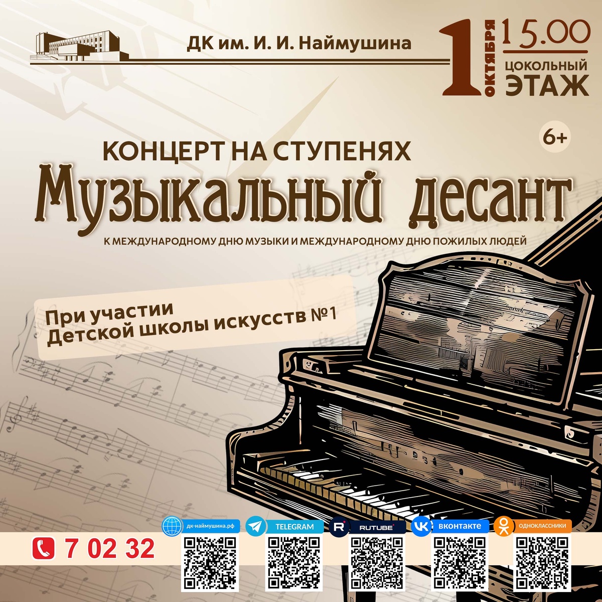 Дорогие друзья! В День добра и уважения и в честь Международного дня музыки приглашаем на камерный концерт на ступенях «Музыкальный десант»! Этот осенний день станет настоящим праздником для всех любителей живой музыки! Вас ждёт тёплая дружеская и творческая атмосфера, романтические ноты рояля, талантливые исполнители и хорошее настроение. Осень – это время, когда музыка звучит особенно ярко! Дата: 1 октября 2025 года Время: 15:00 Место: Цокольный этаж Дворца культуры им. И.И. Наймушина Присоединяйтесь к «Музыкальному десанту» и отметьте Международный день музыки вместе с нами!