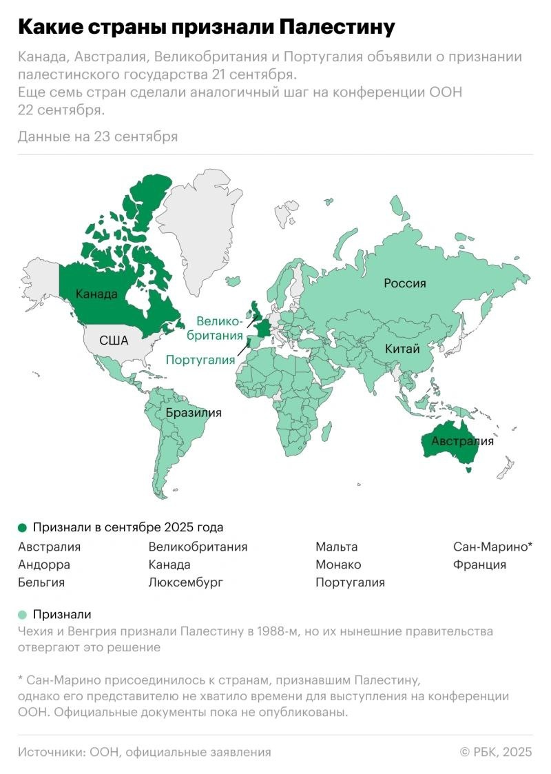 Государство Палестина было провозглашено 15 ноября 1988 года на внеочередной сессии Национального совета Палестины. В качестве правовой основы была объявлена резолюция Генассамблеи ООН от 29 ноября 1947 года о разделе территории подмандатной Британской Палестины на арабское и еврейское государства. ✔️В течение первых двух недель 55 стран, включая такие разные государства, как Советский Союз, Китай, Индию, Грецию, Югославию, Шри-Ланку, Мальту и Замбию признали Палестину. Постепенно к признанию Палестины присоединялись все новые и новые государства. ✔️В 2011 года Палестину приняли в состав ЮНЕСКО. Тогда же глава Палестинской национальной автономии Махмуд Аббас передал Генсеку ООН Пан Ги Муну официальную заявку на вступление Палестины в ООН в качестве полноправного члена. Тогда Совбез эту заявку не поддержал, но а ноябре 2012 года Генассамблея ООН предоставила Палестине статус наблюдателя при организации. ✔️В декабре 2014 года Международный уголовный суд признал Палестину государств