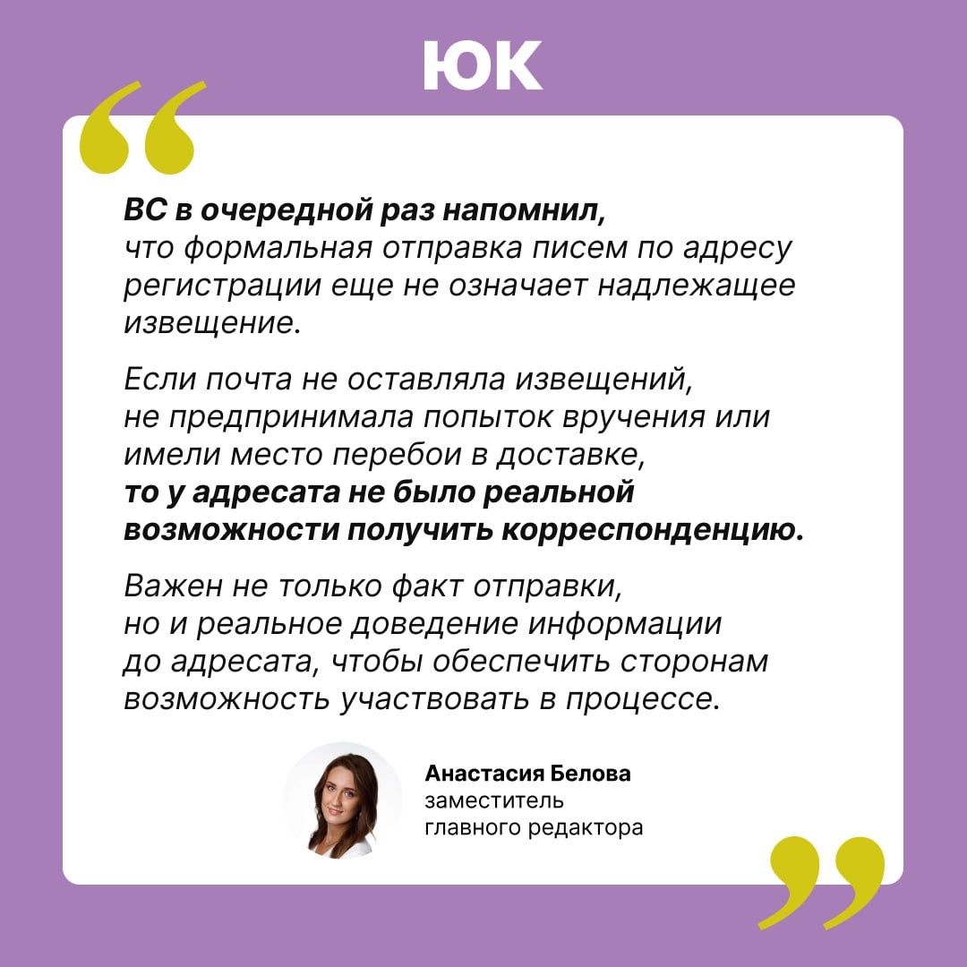 Нет извещений и попыток вручения — участник спора считается не извещенным ➡️ Верховный суд не согласился с апелляцией и кассацией, которые отказались восстановить покупателю срок для подачи жалобы. Ранее суд первой инстанции по требованию конкурсного управляющего признал недействительной сделку по продаже автомобиля. Покупатель утверждал, что не был надлежащим образом извещён о процессе и узнал о решении только из постановления о возбуждении исполнительного производства. ✨ Нижестоящие суды решили, что извещение было надлежащим: письма направлялись по адресу регистрации покупателя и вернулись с отметкой «истек срок хранения». Покупатель не доказал, что почта нарушила порядок доставки или что его адрес вообще не обслуживается. ВС с этим не согласился и направил дело на новое рассмотрение. Он указал: письма действительно прибыли в место вручения и вернулись в суд, но в материалах нет доказательств, что адресату оставлялись извещения по месту жительства или предпринимались попытки вруч