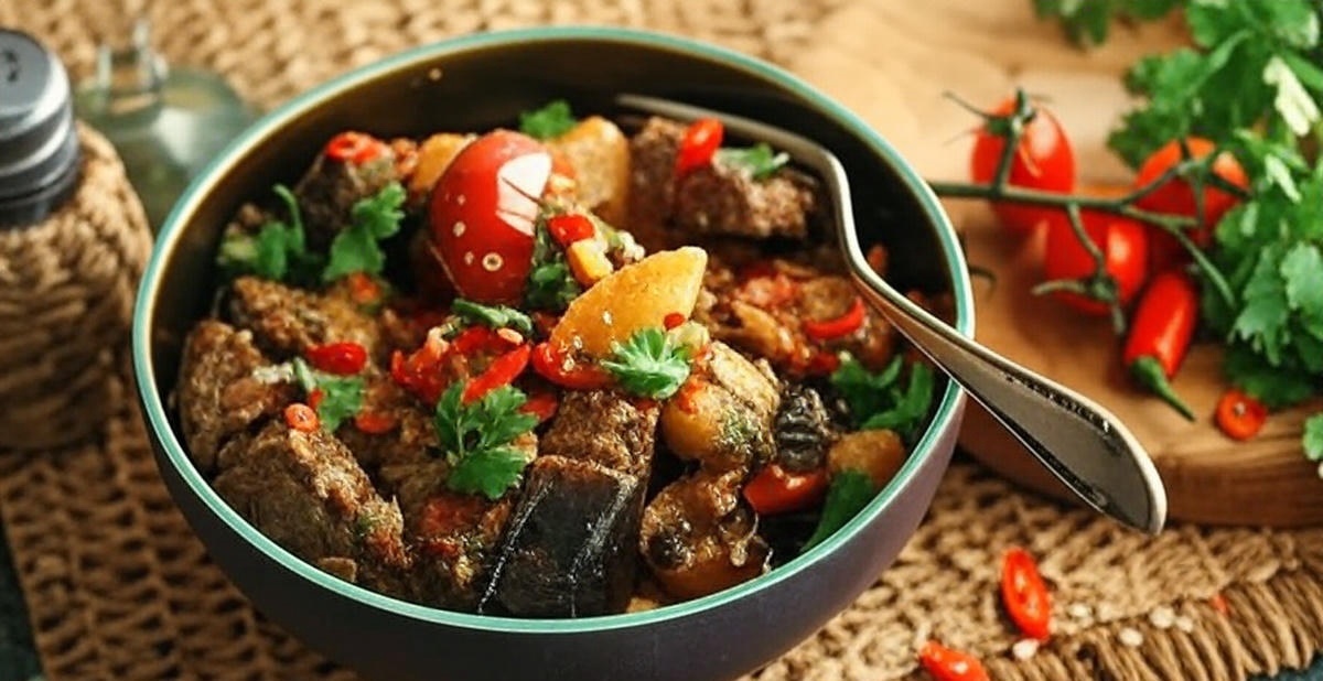 Факт из истории: Название от "аджаб" (удивление) и "сандал" (скамья) — якобы так вкусно, что ешь сидя от восторга. Родом из западной Грузии, популярно с 18 века как летнее блюдо из урожая. Похоже на французский рататуй, но с грузинскими специями.