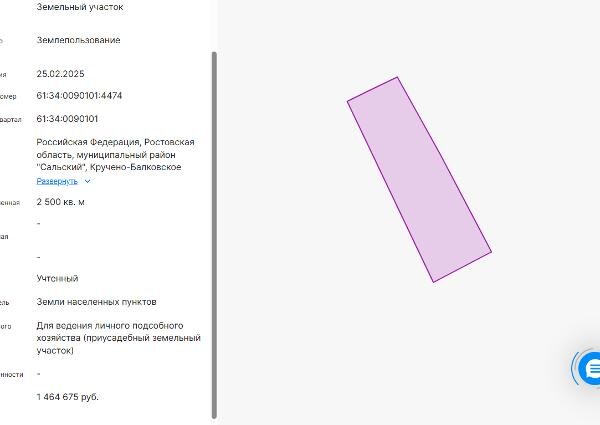 Название: Ростовская область, Сальский район, с.п. Кручено-Балковское, село Крученая Балка, ул. Ленина, земельный участок 118А, КН 61:34:0090101:4474 вид разрешенного использования – для ведения личного подсобного хозяйства (приусадебный земельный участок), площадью 2500 кв. м, вид права – аренда. Канал: Госземля Ростовская область Область: обл Ростовская Район: м.р-н Сальский Населенный пункт: с.п. Кручено-Балковское, с Крученая Балка, ул Ленина земельный участок 118А Локация: Смотреть на карте ВРИ: Жилая застройка Кадастровый номер: 61:34:0090101:4474 Кадастровая стоимость: 1464675.00 Вид сделки: Продажа Площадь: 2500 м² Начальная цена: - руб. Дата завершения: 25.10.2025 Подробнее: ГИС ТОРГИ #госземля #земляотгосударства #земля #земельныйучасток #земельныеторги #торги #аукцион #продажаземли #продажа #ростовскаяобласть