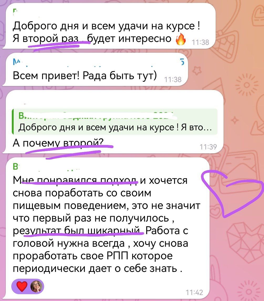 Участницы сегодня добавились в чат и делятся опытом. Мы пока ничего не выдали, первые дни организационные, основная работа с головой и телом начнётся в понедельник. Поэтому вы ещё успеваете. И не важно, первый или второй, или какой вы раз с нами. Если это было для Вас знаком - - ЖМИТЕ СЮДА Мы никогда ничего не повторяем, всегда все выдаём из текущего момента, от себя, аутентично и с горячим желанием, чтобы у Вас все получилось.