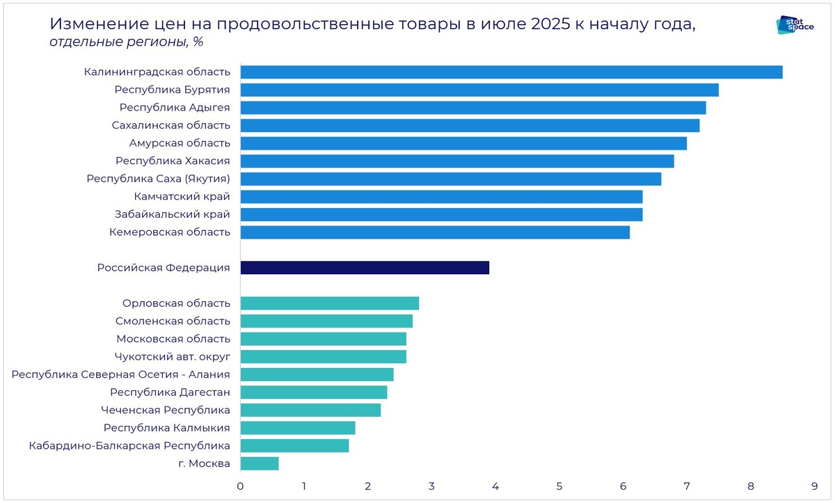 Хуже всего ситуация с ценами на продовольствие в Калининграде (+8.5%), Бурятии (+7.5%) и Адыгее (+7.3%), а также многих регионах Дальнего Востока (+7.2% на Сахалине, +7% в Амурской области и т.д.)