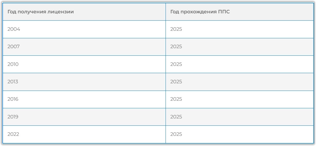 Чтобы не пропустить сроки периодического подтверждения, можете руководствоваться следующей таблицей (внимание! Заявление подаётся за несколько месяцев до окончания трёхлетнего срока с момента получения или последнего подтверждения лицензии):