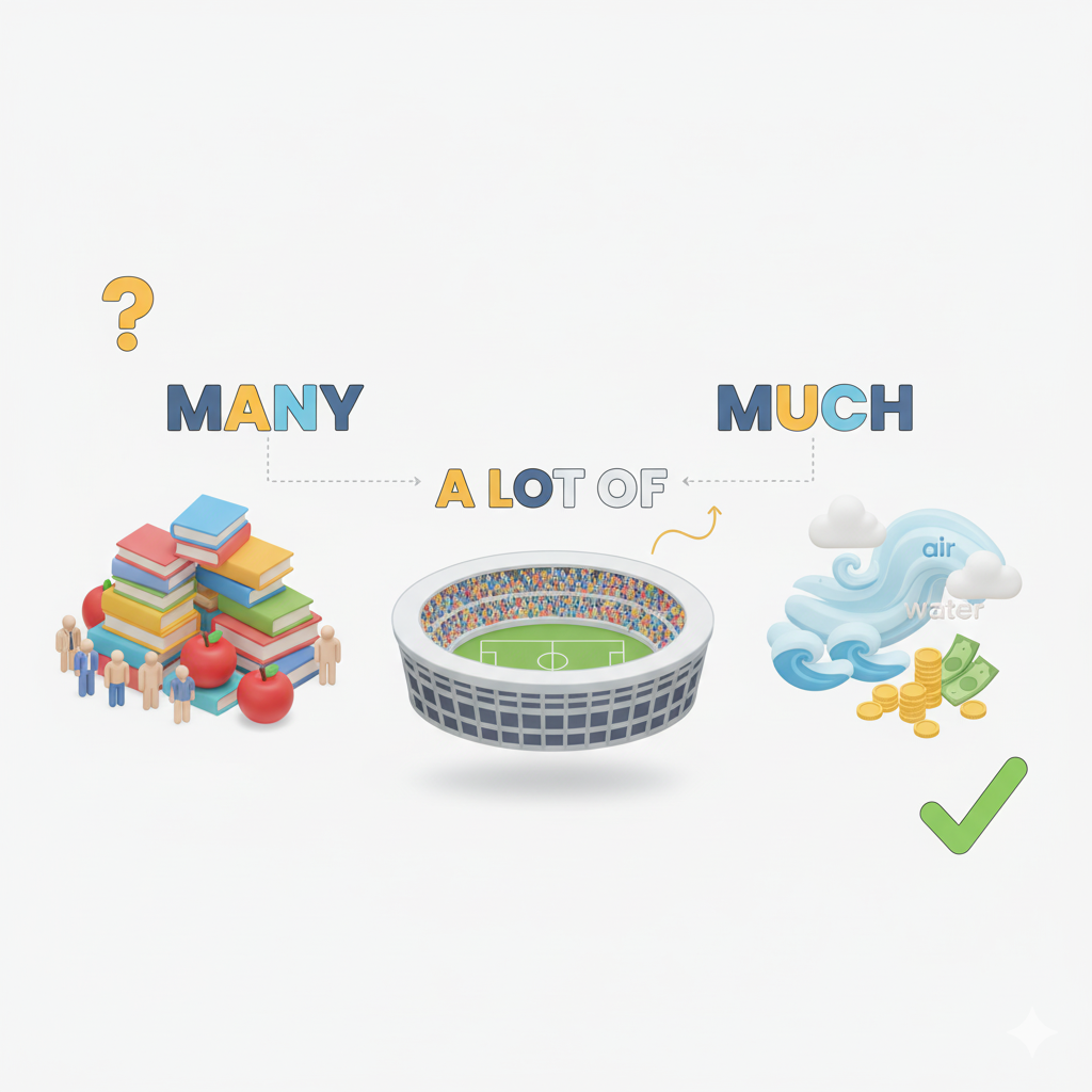 В английском языке есть целая «команда» слов для обозначения количества, но новички часто путаются в трёх главных «игроках»: much, many и a lot of. Хорошая новость: правило простое, а чувство разницы приходит быстро! Давайте разберёмся, чтобы вы звучали уверенно и естественно. Главное правило — что можно посчитать? 👉 Many — наш выбор, когда предметы можно посчитать поштучно (исчисляемые существительные). Представьте себе яблоки, книги, люди, идеи. 👉 Much — используем с тем, что не сосчитаешь поштучно (неисчисляемые существительные). Это как вода, время, деньги (в смысле «сумма»), советы, счастье. 👉 A lot of / Lots of — ваши верные друзья, которые подходят практически для любой вечеринки, и для исчисляемых, и для неисчисляемых понятий! Звучит очень естественно и разговорно. Живой пример из жизни: