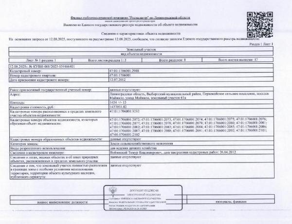 Название: Лот№2 Подвергнутое аресту Выборгским РОСП по и/п 179335/25/47022-ИП и принадлежащее должнику Пинхасик Г.Д. заложенное имущество: земельный участок общ.пл. 1454 кв.м. кадастровый №47:01:1706001:2988 и жилой дом общ.пл. 85,2 кв.м. кадастровый № 47:01:1706001:3232, расположенные по адресу: ЛО, Выборгский район, массив Ильичевский, ул. Майнило, з/у, д. 61А. Канал: Госземля Ленинградская область Область: обл Ленинградская Выборгский район Район: массив Ильичевский Населенный пункт: ул. Майнило, з/у, д. 61А. Локация: Смотреть на карте ВРИ: Жилая застройка Кадастровый номер: 47:01:1706001:2988 Кадастровая стоимость: 1437031.82 Вид сделки: Продажа Площадь: 1454 м² Начальная цена: 6728000.00 руб. Дата завершения: 10.10.2025 Подробнее: ГИС ТОРГИ #госземля #земляотгосударства #земля #земельныйучасток #земельныеторги #торги #аукцион #продажаземли #продажа #ленинградскаяобласть