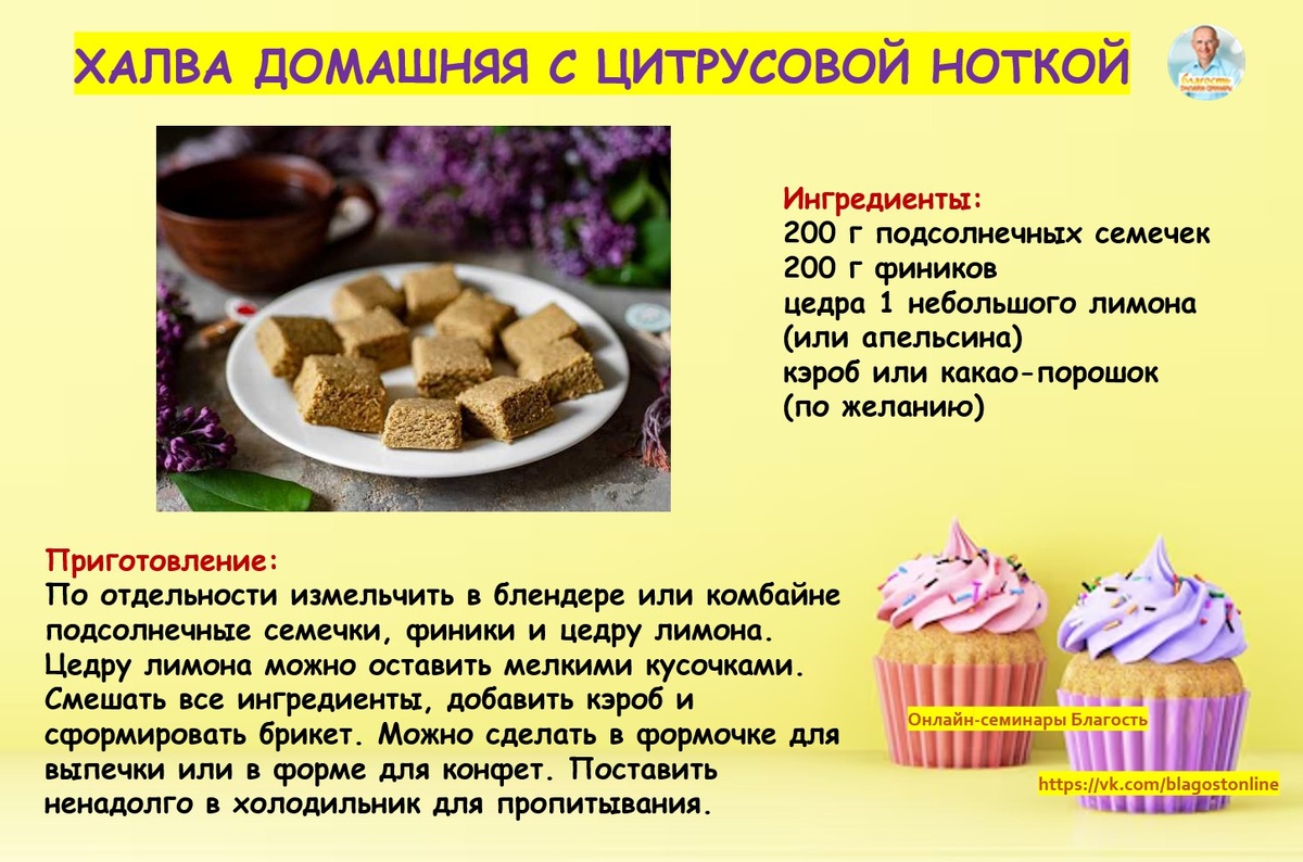 🍪 ХАЛВА ДОМАШНЯЯ С ЦИТРУСОВОЙ НОТКОЙ 🌀 Ингредиенты: 200 г подсолнечных семечек 200 г фиников цедра 1 небольшого лимона (или апельсина) кэроб или какао-порошок (по желанию) 🌀 Приготовление: По отдельности измельчить в блендере или комбайне подсолнечные семечки, финики и цедру лимона. Цедру лимона можно оставить мелкими кусочками. Смешать все ингредиенты, добавить кэроб и сформировать брикет. Можно сделать в формочке для выпечки или в форме для конфет. Поставить ненадолго в холодильник для пропитывания.