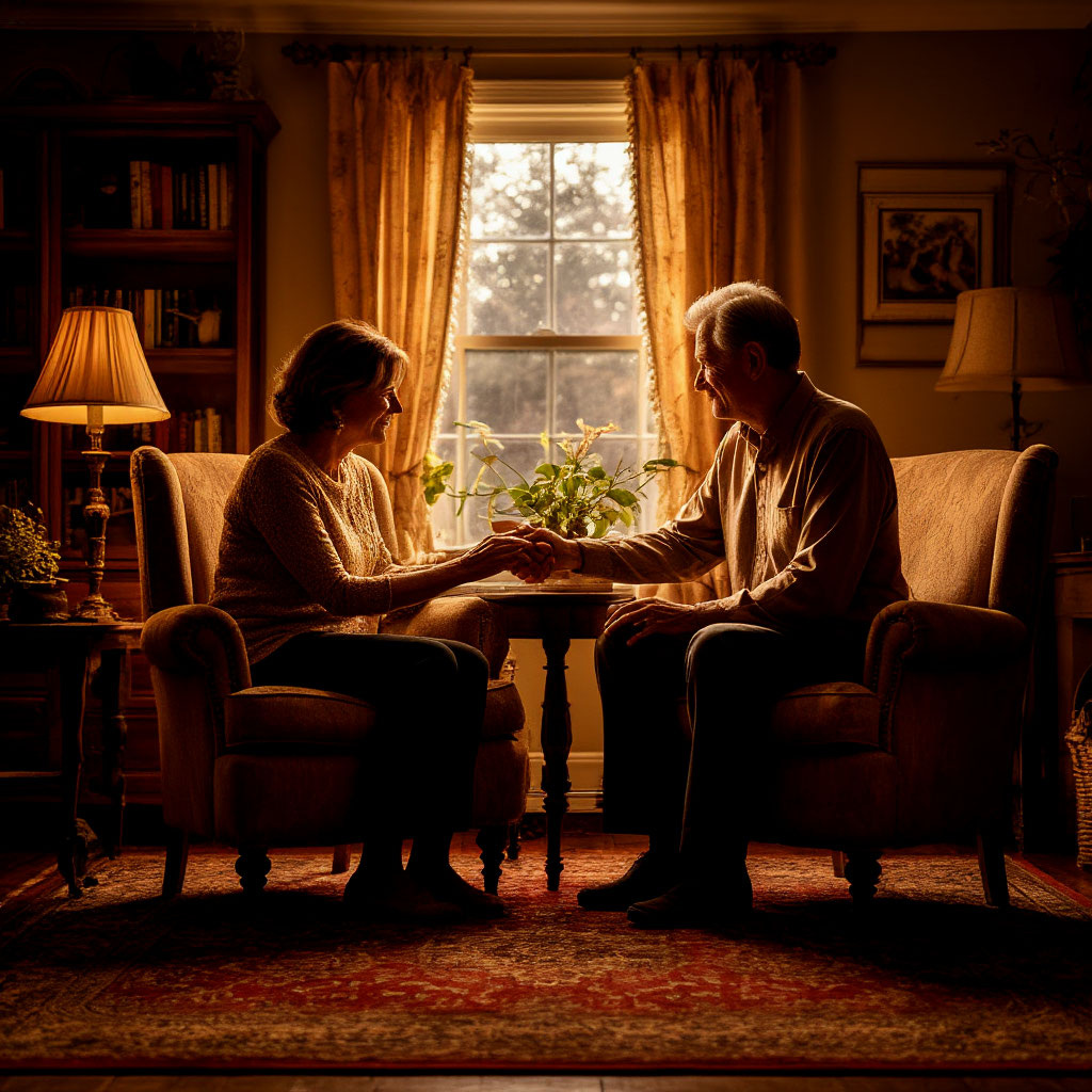 Они сидят в гостиной: мама, накрытая пледом до подбородка, с вязанием в руках, и отец, в очках, читающий газету, которую теперь трудно достать в бумажном виде. Их лица стали другими — мягче и в то же время жёстче. Мама всё чаще смотрит куда-то мимо, за окно, где сад уже давно запущен. А отец больше молчит, и его молчание порой громче любого крика.