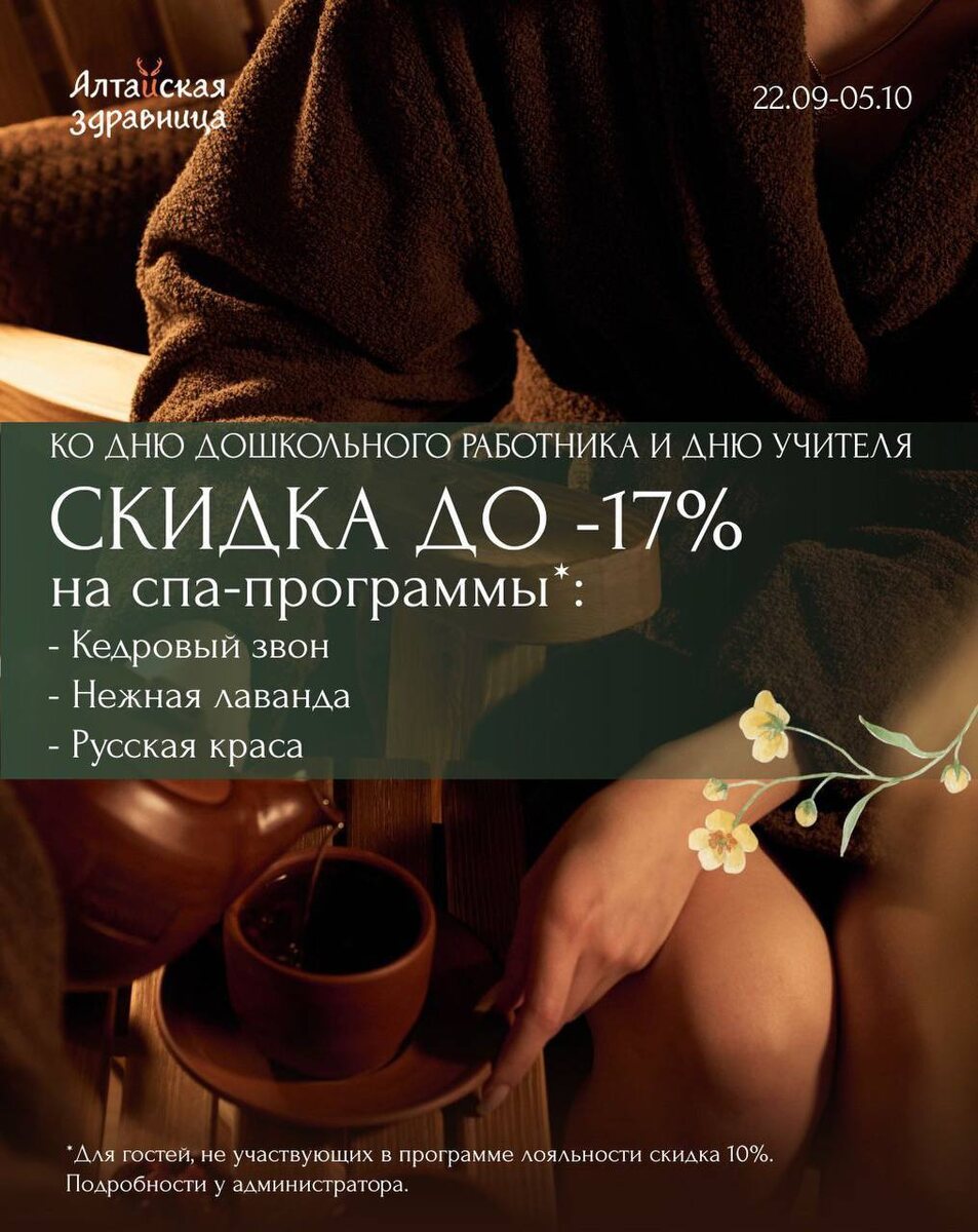 🍂 Осень — время сказать «спасибо». Впереди два особенных праздника — День дошкольного работника и День учителя. Праздник тех, кто каждый день дарит внимание, заботу и знания. В таёжном СПА «Алтайская Здравница» это время наполнено теплом и благодарностью. Здесь, прямо в городе, можно ощутить прикосновение природы: мягкий пар фитосауны, природные ароматы трав и цветов, медленное погружение в атмосферу отдыха и умиротворения. 🌿 С 22 сентября по 5 октября действуют особые условия до 17% на программы, созданные для восстановления сил и гармонии. 🎁 Подарочный сертификат на эти программы - это знак признательности, который сохраняет атмосферу уюта и заботы. Ознакомиться с программами можно у администратора в директ https://vk.com/altay.spa.rostovnd