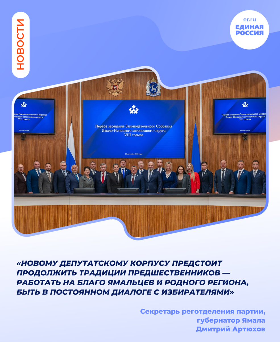 «Новый состав парламента очень сильный: в него вошли государственные деятели с большим опытом в региональном и муниципальном управлении, парламентской работе, эксперты в нефтегазовой отрасли и социальной сфере, участник СВО, представитель молодежи. Это позволит обеспечить разностороннее уверенное развитие округа, слышать и понимать запросы всех категорий ямальцев, принимать эффективные решения», – говорит Дмитрий Артюхов.