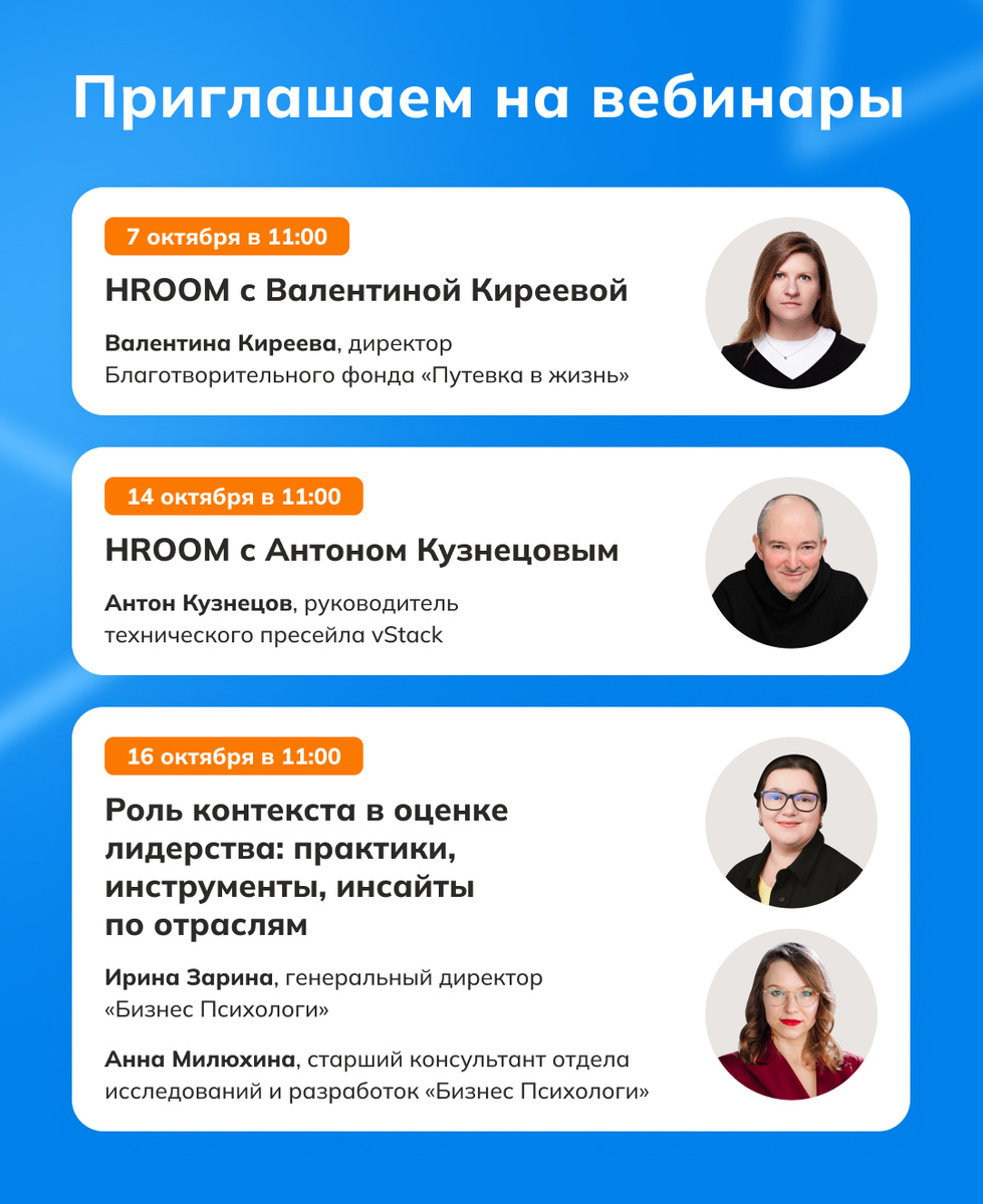 Коллеги, приглашаем принять участие в ближайших вебинарах. Регистрируйтесь заранее и готовьте вопросы гостям. 💻 7 октября в 11:00 гостем проекта #HRoom станет Валентина Киреева, директор Благотворительного фонда «Путевка в жизнь». Зарегистрироваться 💻 14 октября в 11:00 приглашаем на #HRoom с Антоном Кузнецовым, руководителем технического пресейла vStack, членом Правления Санкт-Петербургского Клуба ИТ-директоров и экспертного совета клуба ИТ-Диалог. Антон является амбассадором ВШЭ и модератором IT/HR мероприятий. Зарегистрироваться 💻 16 октября в 11:00 пройдёт вебинар «Роль контекста в оценке лидерства: практики, инструменты, инсайты по отраслям». Наши эксперты расскажут о моделях эффективного поведения для руководителей и о том, как контекст влияет на эффективность управления с учетом стратегических задач бизнеса. Вебинар проведут Ирина Зарина, генеральный директор «Бизнес Психологи» (ex. SHL Россия) и Анна Милюхина, старший консультант отдела исследований и разработок, «Бизнес Пси