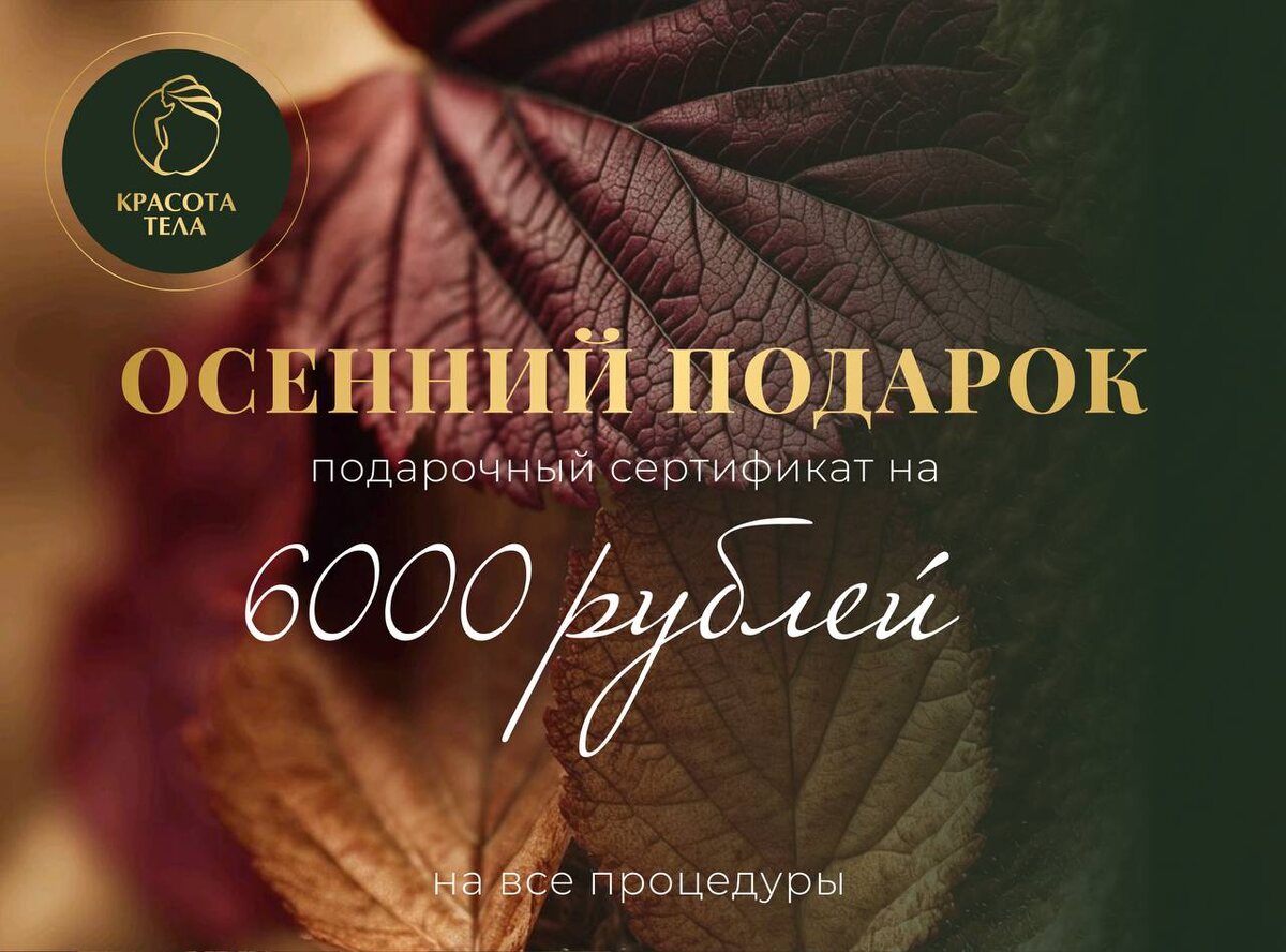 🍂НАШ ОСЕННИЙ ПОДАРОК ВАМ!🍂 Осень время действовать вместе с КРАСОТА ТЕЛА! Мы решили продлить для вас бабье лето и подарить тепло заботы даже тогда, когда за окном холодает. До Нового 2026 года осталось совсем немного. Представьте, как вы встречаете 🥂праздник в идеальной форме — красивой, уверенной и сияющей! Лучшее время начать прямо сейчас! Дарим вам подарочный сертификат на 6000 руб!💰 Используйте его на любимые процедуры в КРАСОТА ТЕЛА и сделайте шаг к телу мечты и праздничному настроению. Предложение ограничено! ПОЛУЧИТЬ СЕРТИФИКАТ 🎁 Не откладывайте - позаботьтесь о себе сегодня, чтобы встретить 2026 год на высоте!✨