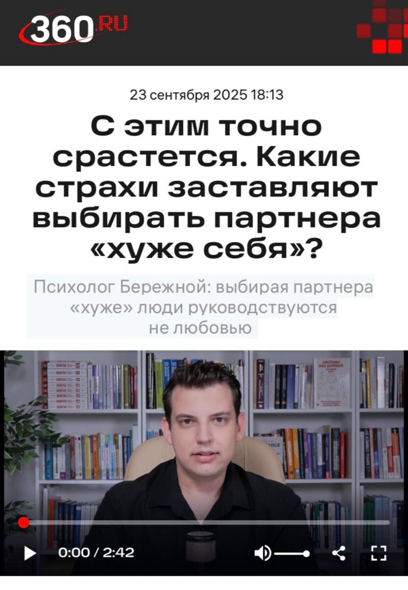 Это не просто «невезение», за этим стоят конкретные психологические механизмы и страхи, которые заставляют нас подсознательно выбирать партнера «похуже себя». Данил Бережной - бизнес-психолог для издания 360.ru раскрыл главные причины этого феномена. В статье Вы узнаете: 📍Читайте статью и делитесь в комментариях: как Вы считаете почему умные и успешные люди часто оказываются в отношениях с теми, кто их недооценивает?