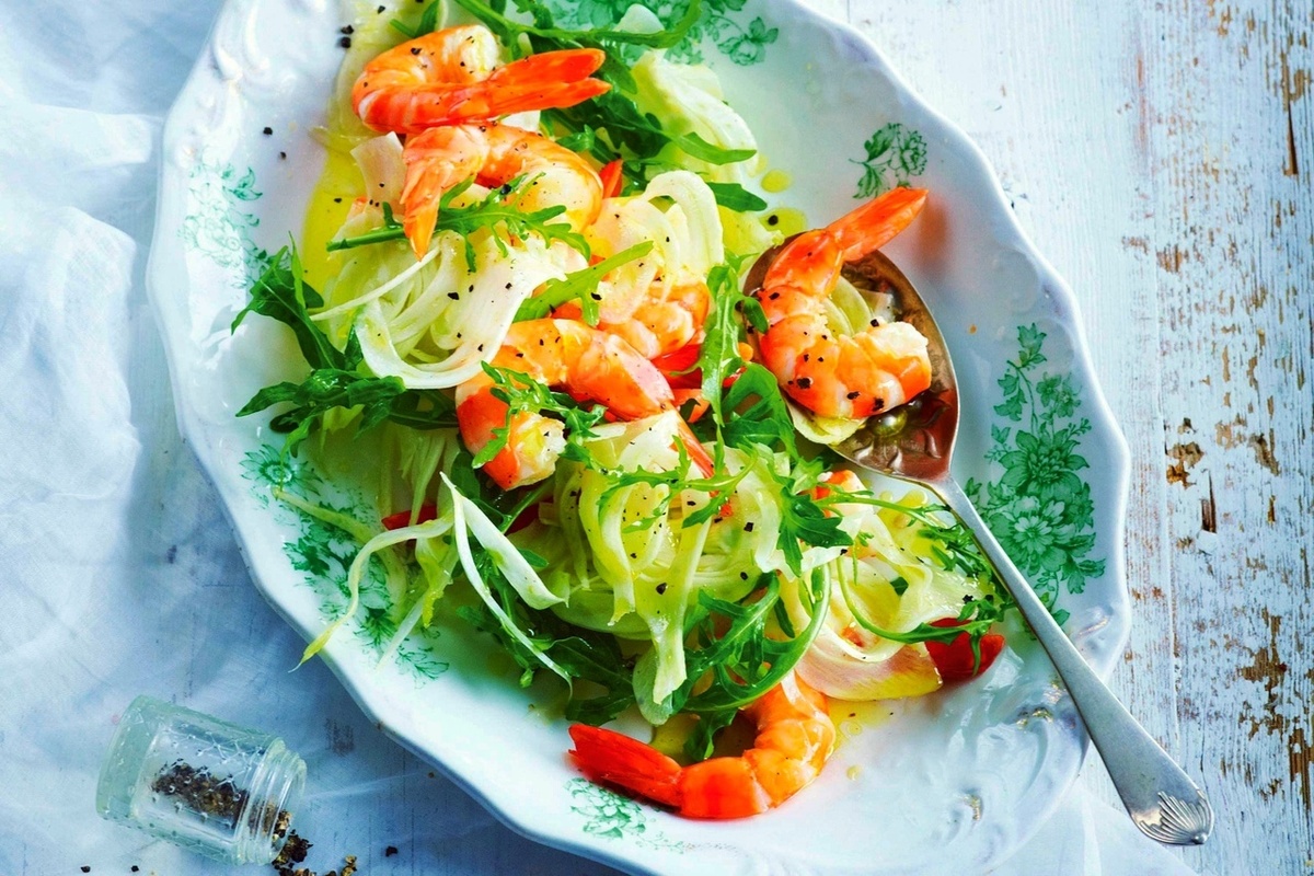 Ингредиенты: 2 ч.л тертой лимонной цедры, 50 мл лимонного сока, 2 ст.л оливкового масла, 1 апельсин, 2 ст.л апельсинового сока, 2 ст.л тертую лимонную цедру, 450 г креветок (очистите), 2 ст.л мелко порубленного лука шалот, 2 плода фенхеля (очистите и удалите сердцевину), соль и свежемолотый перец. ■ В миске смешайте половину лимонной цедры, половину лимонного сока и 1 ст.л масла. Добавьте креветки и дайте настояться около 30 минут.
