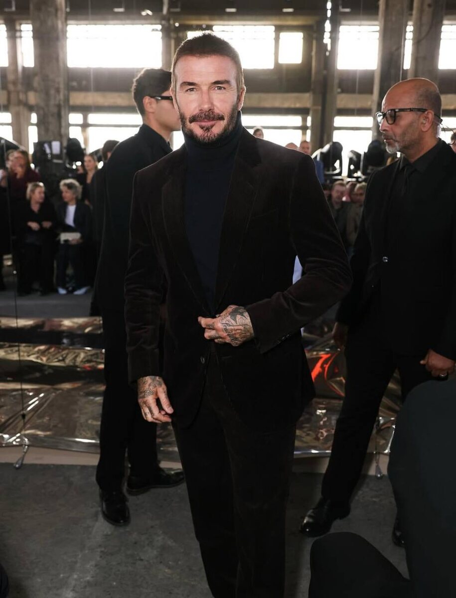 Сэр Дэвид Бекхэм и его щетина на показе Boss в Милане. Куда смотрит Виктория?