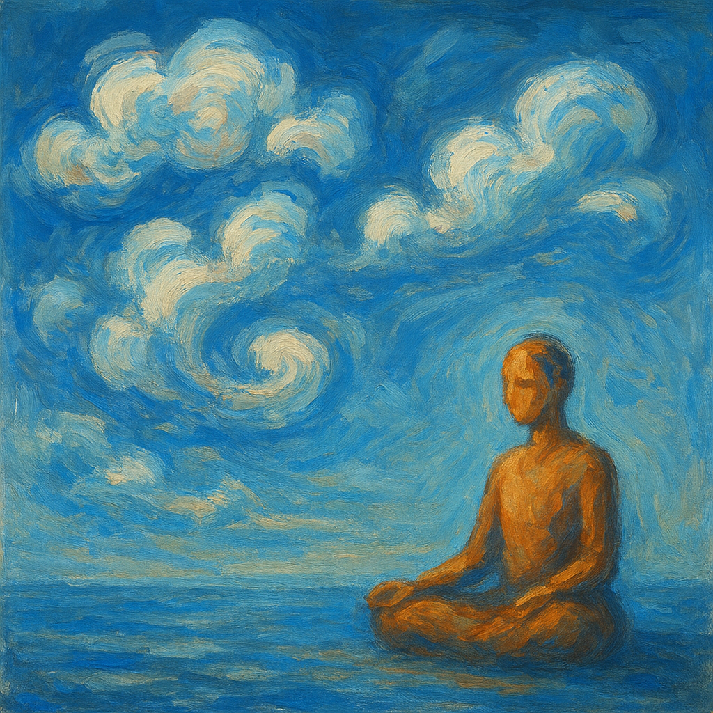 Представь небо и облака. Мысли и дела — это облака, они постоянно движутся, меняют форму. Но небо остаётся тем же — просторным и ясным. Когда облака рассеиваются, становится видно: ценность не в их бесконечном движении, а в глубине самого неба.