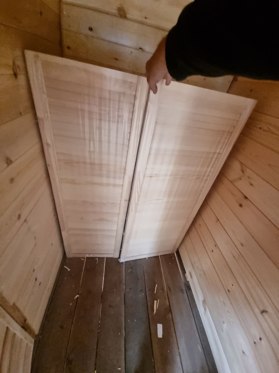 Прикупил деревянные жалюзийные двери для шкафчика в предбаннике.