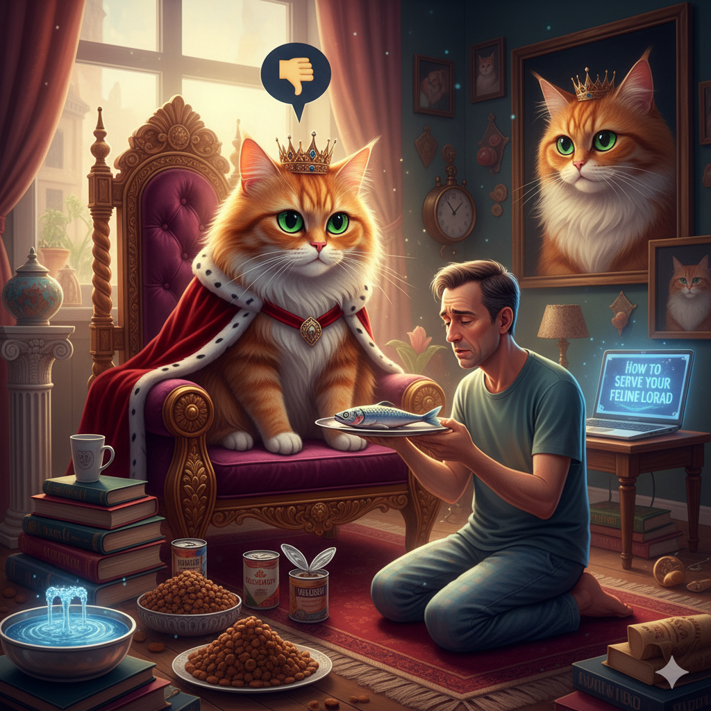 Вы совершили роковую ошибку. Вы посмотрели в эти бездонные глаза, увидели эти милые ушки, этот пушистый хвост и подумали: "Я заведу себе питомца". Поздравляем. Вы не завели питомца. Вы прошли собеседование на должность пожизненного, круглосуточного, безропотного обслуживающего персонала при высшем существе. Ваш кот — это не просто животное. Это божество в миниатюре, сошедшее в наш бренный мир, чтобы судить вас, принимать от вас дары и изредка, в порыве снисхождения, позволять вам почесать его за ухом. Ваша задача — не "заботиться" о нём, а служить ему. Это пособие поможет вам понять основы этикета и, возможно, заслужить мурчание вместо презрительного взгляда. Еда — это не просто еда. Это — дань. Это — ежедневное доказательство вашей преданности. Прикосновение к священному меху — это не ваше право, а привилегия, которую нужно заслужить. Коты не мяукают, они отдают приказы. Ваша задача — правильно их расшифровывать. Вы должны осознать: вы живёте не в своей квартире, а получили разрешение