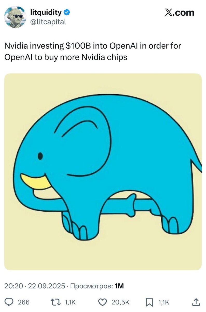 Бигтех проворачивает мошеннические схемы, а в X тем временем на эту тему лепят мемы. А теперь редакция канала «Лобушкин» покажет вам фокус с проворотом денег между бигтех-компаниями — внимательно следите за руками: никакой честности, исключительно махинация. OpenAI объявляет о проекте Stargate и о том, что инвестирует $300 млрд в Oracle, первые $100 ярдов уже улетели. Сделка попадает в квартальные отчёты Oracle, и акции компании улетают в космос. За пару дней Ларри Эллисон стал самым богатым человеком мира (мы об этом писали, кстати). Теперь уже Oracle берёт 100 ярдов и даёт их Nvidia, чтобы закупить ещё видеокарт для серверов, которые сдают OpenAI, — вот ещё один контрактик на 40 ярдов. Nvidia бьёт все рекорды капитализации и становится самой богатой компанией мира. Далее Nvidia берёт эти деньги и возвращает Сэму Альтману в виде инвестиций. Стоимость OpenAI растёт, и, следовательно, больше инвесторов хотят влить денег в этот стартап. То есть они крутят деньги между собой, становятс