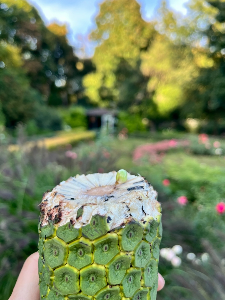 – Пыльцу получили от монстеры с экостанции «Росток». Такое перекрестное опыление принесло свои плоды! В одном из соплодий завязались семена, – рассказывает ботанический сад. И спустя год, 21-го сентября 2025-го, на экскурсии дегустации гостья Татьяна увидела первое семечко. Это было настоящее чудо.