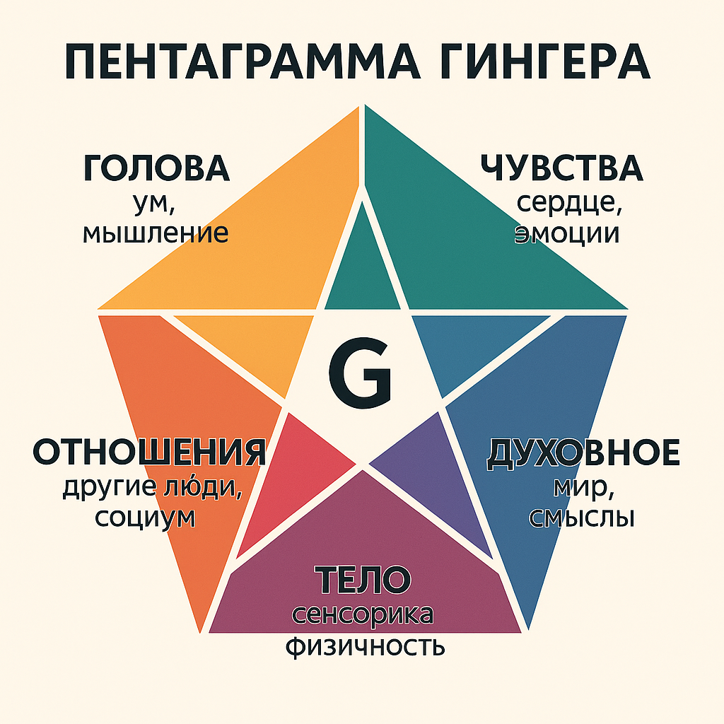 Многие мыслители и исследователи стремились построить интегральные модели, позволяющие увидеть целостность и взаимосвязь процессов обычно воспринимаемых как разрозненные. В философии и психологии XX века таких попыток было немало: от работ Жана Пиаже о стадиях когнитивного развития до системной теории Людвига фон Берталанфи, от юнговской модели архетипов до концепции уровней потребностей Абрахама Маслоу. Все эти проекты объединяло одно: желание обнаружить скрытый порядок в многообразии человеческого опыта и показать, что рост и развитие возможны лишь тогда, когда разные измерения жизни не оторваны друг от друга, а интегрированы. В русле этих поисков целостности родилась одна из наиболее интересных психологических моделей - пентаграмма (пятиконечная звезда) Сержа Гингера, французского психотерапевта, основателя Парижской Школы Гештальта. Гингер предложил схему, которая на первый взгляд выглядит простой: пятиконечная звезда, символизирующая основные измерения человеческого существования.