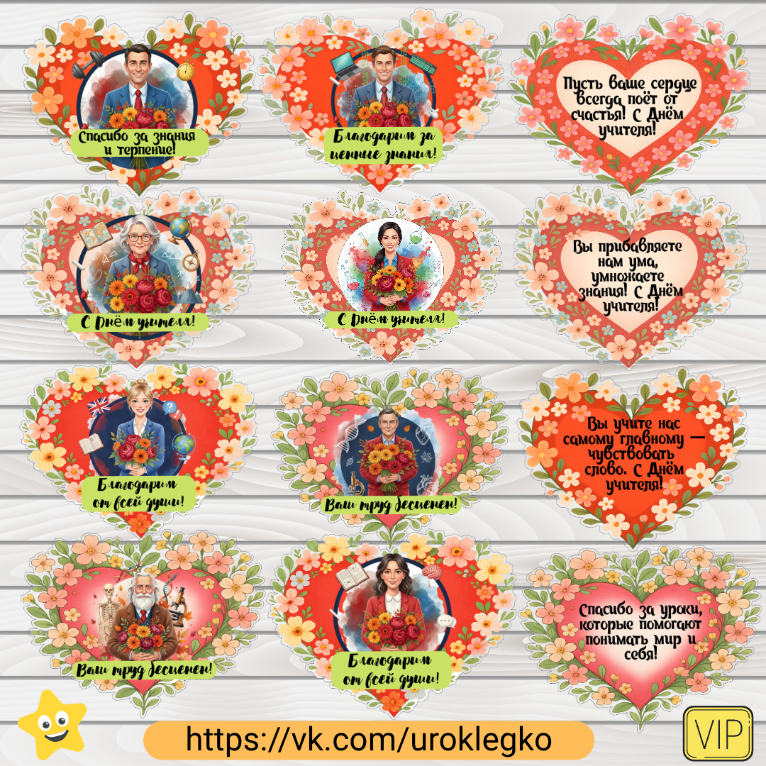 В наборе 41 цветное сердце для разных учителей-предметников с кратким пожеланием. В формате А4.