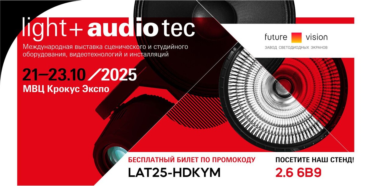 Выставка Light + Audio Tec 2025 пройдет с 21 по 23 октября 2025 года в «Крокус Экспо» по адресу: Московская область, Красногорск, Международная улица, 16. Завод Future Vision вы сможете найти в павильоне 2, зал №6, на стенде №6В9.