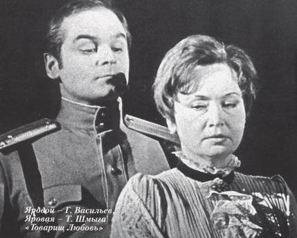 …в октябре 1977 года был выпущен ещё один и тоже не совсем обычный для театра оперетты спектакль – «Товарищ Любовь». Необычность была в том, что композитор Вадим Ильин и поэт Юрий Рыбчинский написали его на основе пьесы К. Тренева «Любовь Яровая». Пьесы настолько известной, которую столько раз ставили чуть ли не во всех драматических театрах страны, что казалось – сыграть её как-то по-иному, свежо уже не возможно – настолько она примелькалась, приелась. Но и композитор, и автор либретто, и постановщик – им был Ю. А. Петров – доказали, что революционная тема, героико-романтический спектакль вовсе не противопоказаны театру оперетты. Музыка Вадима Ильина… была замечательной.